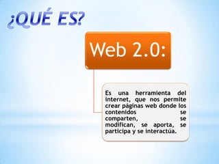 La web 2.0 es una herramienta de internet que promueve la interacción y participación en la creación de contenidos, favoreciendo el modelo constructivista y el autoaprendizaje. Incluye diversas plataformas como blogs, podcasts, y redes sociales, que permiten a los usuarios ser creadores activos de contenido. Además, se destaca su accesibilidad y capacidad para desarrollar habilidades de redacción y fomentar la investigación entre los usuarios.