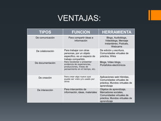 La Web 2.0 permite nuevas herramientas de comunicación para compartir información y conocimiento. Ofrece ventajas como la colaboración a través de wikis, y la documentación y creación mediante blogs y portafolios. Sin embargo, los docentes a menudo carecen de formación en estas herramientas. Las instituciones también enfrentan desafíos como equipos insuficientes, falta de coordinación e infraestructura inadecuada.