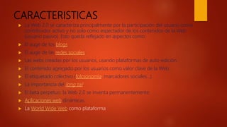 El documento define la Web 2.0 como el fenómeno social surgido del desarrollo de aplicaciones en Internet que distinguen la primera época de la web, donde los usuarios eran pasivos, de la revolución causada por el auge de blogs, redes sociales y otras herramientas que permiten una mayor interacción entre usuarios. La Web 2.0 se caracteriza principalmente por la participación activa de los usuarios como contribuyentes de contenido a través del uso de blogs, redes sociales y plataformas de autoedición.