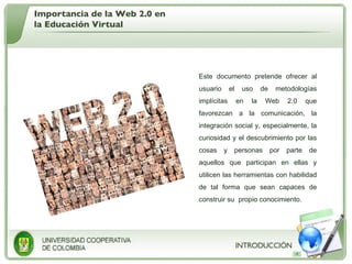 Este documento describe la importancia de la Web 2.0 en la educación virtual. Explica que la Web 2.0 permite la comunicación, integración social y el descubrimiento a través de herramientas colaborativas. También proporciona una conceptualización de la Web 2.0, características de servicios como blogs y wikis, y las implicaciones educativas como nuevos roles para profesores y estudiantes, y aprendizaje autónomo y colaborativo. Finalmente, discute los requisitos como infraestructura, competencias digitales y form