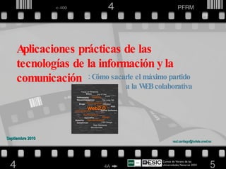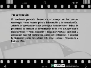 El documento describe un seminario sobre las aplicaciones prácticas de las tecnologías de la información y la comunicación. El seminario enseña conceptos fundamentales de la web 2.0 y cómo usar herramientas como blogs, wikis, podcasts y almacenar multimedia. Los objetivos incluyen aprender sobre la web 2.0, crear blogs y wikis, y conocer otras herramientas como buscadores 2.0, redes sociales y lectores RSS.