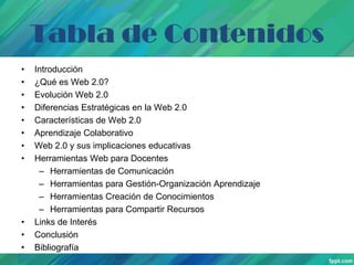 El documento describe las herramientas de la Web 2.0 y sus usos en la educación. Explica que la Web 2.0 permite la interactividad, el aprendizaje colaborativo y la multidireccionalidad de la información. También caracteriza a la Web 2.0 por permitir software sin instalación, colaboración en línea, nuevos métodos de trabajo y comunicación, y redes de colaboración. Finalmente, destaca que las herramientas colaborativas de la Web 2.0 pueden favorecer un aprendizaje que involucre la