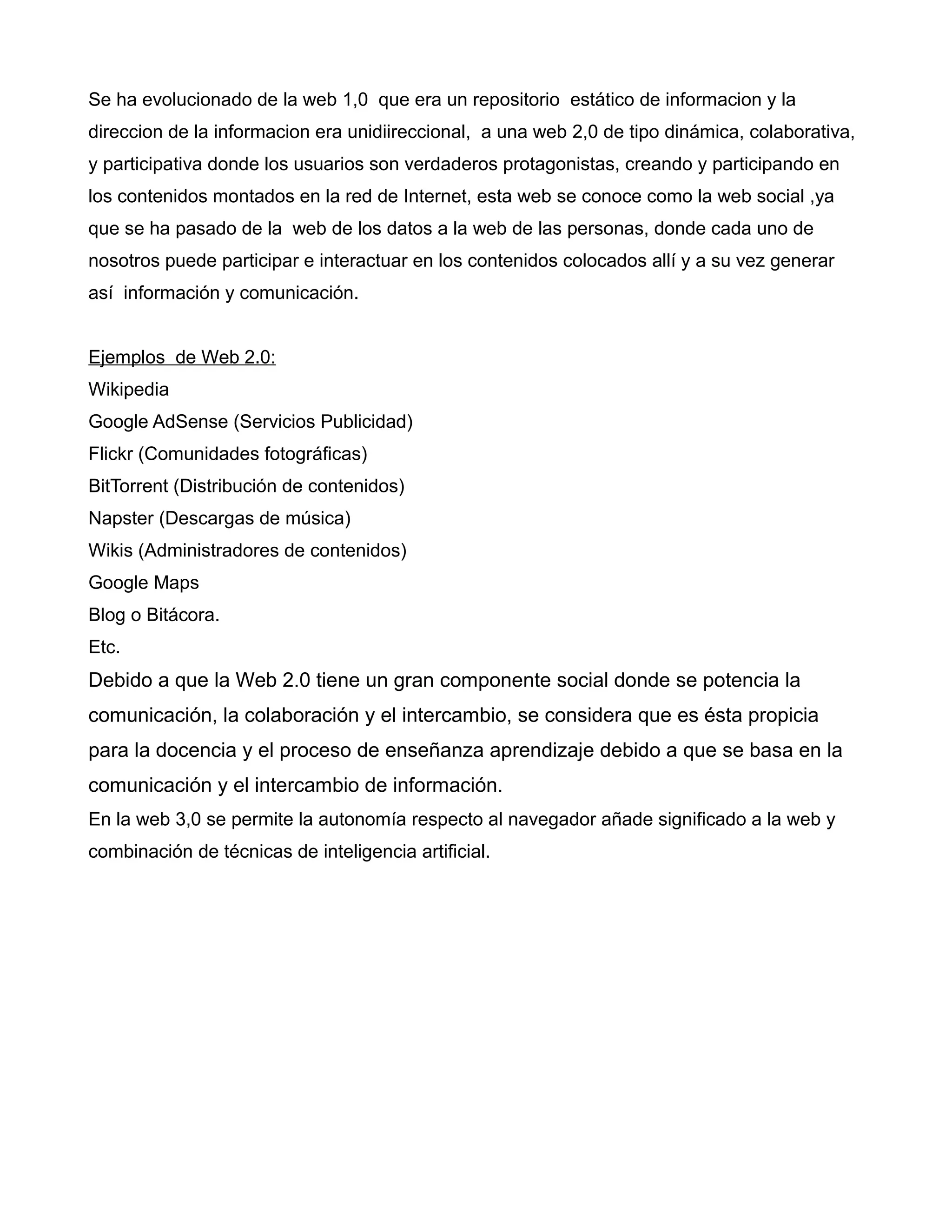 El documento describe la evolución de la web de una versión estática (Web 1.0) a una dinámica, colaborativa y participativa (Web 2.0) donde los usuarios crean y comparten contenido. Luego menciona ejemplos de sitios Web 2.0 como Wikipedia, Flickr y blogs. Explica que la Web 2.0 es adecuada para la enseñanza debido a su enfoque en la comunicación y el intercambio de información. Finalmente hace referencia a características potenciales de las futuras Web 3.0, 4.0