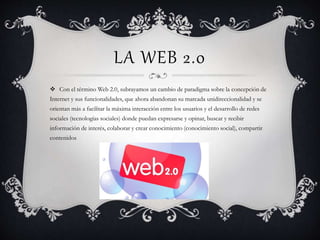 El documento describe la Web 2.0 como un cambio de paradigma que promueve la interacción y colaboración entre usuarios a través de redes sociales y herramientas en línea. Destaca su importancia al reducir costos de difusión y democratizar el acceso a la información, permitiendo a cualquier individuo publicar noticias. Se mencionan varias herramientas de la Web 2.0, como Blogger, Google, marcadores sociales, redes sociales y Yahoo, que facilitan el intercambio y organización del conocimiento.
