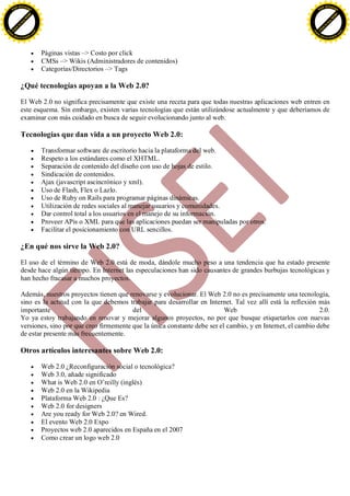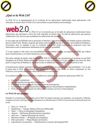 La Web 2.0 representa la evolución de aplicaciones tradicionales a aplicaciones enfocadas en el usuario final que funcionan a través de Internet. Se caracteriza por fomentar la colaboración y reemplazar aplicaciones de escritorio con servicios. Surge de la transición de sitios estáticos con poca interacción a aplicaciones con funcionalidades sorprendentes impulsadas por desarrolladores independientes. Se ilustra con ejemplos que muestran la transición de servicios como DoubleClick a Google AdSense o de páginas personales a blogs.