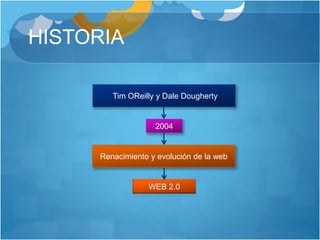 El documento describe la evolución de la Web 1.0 a la Web 2.0, donde la Web 1.0 era principalmente de solo lectura mientras que la Web 2.0 permite una mayor interacción y colaboración entre usuarios. Algunas aplicaciones clave de la Web 2.0 incluyen blogs, wikis, redes sociales y plataformas para compartir contenido como YouTube y Flickr. La Web 2.0 ofrece ventajas como herramientas fáciles de usar, espacios de trabajo colaborativos y mayor capacidad para la comunicación y el aprendizaje