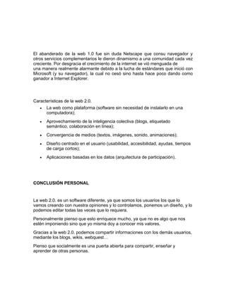 El documento habla sobre la Web 2.0. Explica que fue creado el término por Dale Dougherty y que se refiere a una web social donde los usuarios generan contenido en lugar de solo consumirlo, en un entorno de software social. La Web 2.0 pone al usuario en el centro permitiéndole editar, seleccionar y controlar contenidos para compartir conocimientos con otros. Características clave incluyen wikis, blogs, etiquetado semántico y colaboración en línea.