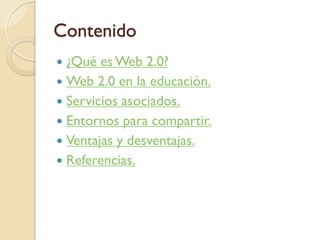 Este documento describe las herramientas de Web 2.0 y su aplicación en la educación. Explica que Web 2.0 se refiere a sitios web interactivos que permiten la colaboración y la inteligencia colectiva. Describe cómo las herramientas como blogs, wikis, documentos compartidos y redes sociales pueden usarse en la educación, y menciona algunas ventajas como fomentar el diálogo y la colaboración, pero también desventajas como la necesidad de capacitar a los maestros.