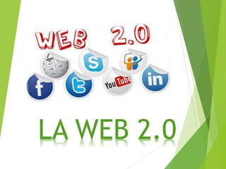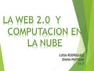 Este documento describe la Web 2.0 y la computación en la nube. Explica que la Web 2.0 permite a los usuarios interactuar y colaborar generando contenido, a diferencia de sitios estáticos. También compara las características de la Web 1.0 y 2.0. Describe algunas herramientas de la Web 2.0 como Google Maps, Scribd y SlideShare. Finalmente, define la computación en la nube como un sistema basado en Internet y centros de datos remotos para gestionar servicios e información de forma remota.
