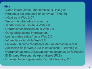 El documento habla sobre la Web 2.0 y sus características principales. Explica que la Web 2.0 permite a los usuarios crear y modificar contenido fácilmente a través de herramientas como blogs, wikis, redes sociales y compartición de medios. También describe algunas de las aplicaciones y sitios web más populares de la Web 2.0 como YouTube, Facebook y Wikipedia.