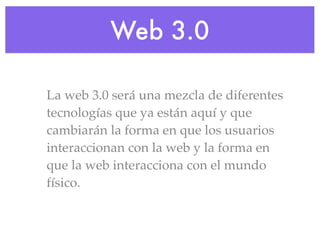 La web 3.0 integrará tecnologías como la web semántica, la web ubicua, internet de las cosas, realidad aumentada, cloud computing y tecnologías abiertas. Esto cambiará la forma en que los usuarios interactúan con la web y cómo la web interactúa con el mundo físico, permitiendo el acceso desde cualquier lugar y dispositivo, la interconexión de objetos, la mezcla de realidad y virtualidad, y el acceso a aplicaciones a través de la nube.