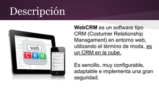 WebCRM es un software de gestión de relaciones con clientes (CRM) basado en la nube. Proporciona funciones como marketing por correo electrónico, gestión de actividades, ventas y presupuestos. Es un sistema intuitivo y configurable que puede ejecutarse en la web o a través de aplicaciones móviles. El software se licencia bajo un modelo de pago y soporte.