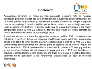 El documento describe cómo la Web 2.0 puede apoyar a los tutores en la enseñanza virtual. Explica herramientas como blogs, Google Docs y Voxopop que permiten la colaboración y discusión. También describe los perfiles de usuario, entornos personales de aprendizaje y cómo estas herramientas pueden mejorar la expresión de los estudiantes y facilitar el aprendizaje independientemente del lugar o momento.
