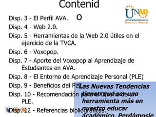 Este documento describe las herramientas de la Web 2.0 y cómo pueden usarse para mejorar la tutoría virtual de cursos académicos. Explica que las herramientas como blogs, wikis, redes sociales y Voxopop permiten una mayor interacción entre estudiantes y profesores. También habla sobre los entornos personales de aprendizaje, que permiten a los profesores gestionar su propio aprendizaje a través de varias herramientas en línea de manera colaborativa. El documento recomienda usar estas her