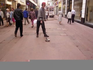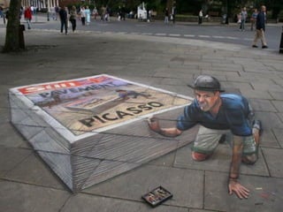 Este documento presenta al artista Julian Beever y sus dibujos ilusóricos de tiza que parecen tener tres dimensiones cuando se miran desde ciertos ángulos. Muestra varios ejemplos de sus dibujos ilusorios de tiza en el suelo y explica cómo se ven en tres dimensiones desde algunos ángulos pero no desde otros.