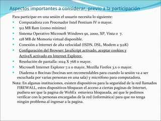 Para participar en una sesión Webex, el usuario necesita una computadora con ciertas especificaciones mínimas, conexión a Internet de alta velocidad, y configurar el navegador para permitir cookies y ActiveX. Al ingresar a la sesión, el usuario verá paneles para participantes, chat y control de audio, y debe pedir permiso para usar el micrófono. Para salir de la sesión, el usuario debe seleccionar la opción "Abandonar la sesión de formación".