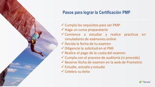 Este documento proporciona información sobre cómo obtener la certificación PMP. Explica los pasos para lograr la certificación, incluidos cumplir con los requisitos, tomar un curso de preparación, estudiar y practicar, programar el examen, y celebrar una vez aprobado. También cubre los requisitos específicos, la diferencia entre PMP y CAPM, y recomendaciones para aprobar el examen a la primera.