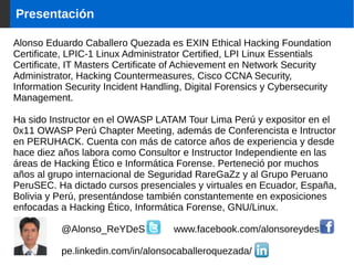 Este documento presenta Wireshark, un analizador de paquetes de red gratuito y de código abierto. Wireshark permite capturar y analizar paquetes de red, y es utilizado por administradores de red, ingenieros de seguridad, y desarrolladores. El documento describe las características y usos de Wireshark, incluyendo la captura en vivo de paquetes, filtrado de paquetes, y exportación de datos capturados. También promueve otros cursos y contenidos del instructor sobre hacking ético e informática forense.