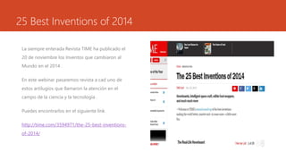 Este documento presenta un resumen de un webinar sobre los 25 mejores inventos del 2014 según la revista TIME. El webinar revisa cada uno de estos inventos que llamaron la atención en el campo de la ciencia y la tecnología, incluyendo la aerotabla, reactores de fusión nuclear compactos, carga inalámbrica, impresión 3D y relojes inteligentes. El documento proporciona enlaces para obtener más información sobre cada invento presentado.