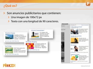 Este documento proporciona información sobre anuncios en Facebook. Explica los diferentes tipos de anuncios como anuncios estándar, anuncios de páginas de fans, historias patrocinadas, anuncios de aplicaciones y eventos. También describe cómo medir el rendimiento de las campañas, los beneficios de la segmentación en Facebook, cómo crear anuncios y consejos para una campaña efectiva.