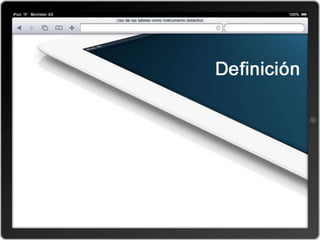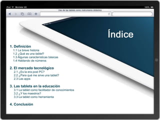 El documento describe el uso de tablets como herramientas educativas. Explica brevemente la historia de las tablets y sus características principales. Luego discute cómo las tablets se han convertido en una parte importante del mercado tecnológico y cómo pueden usarse para facilitar el aprendizaje a través de aplicaciones educativas e iBooks. Finalmente, explica cómo las tablets pueden usarse como herramientas en el aula para apoyar diferentes estilos de aprendizaje.