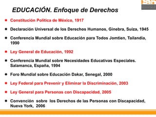 Este documento discute la importancia de la educación inclusiva según los derechos humanos. Resalta varias conferencias y leyes internacionales que promueven la educación para todos. Explica que la educación inclusiva requiere cambios a nivel de políticas, escuelas, familias, alumnos y docentes para asegurar que todos los estudiantes, incluyendo aquellos con discapacidades o necesidades especiales, tengan acceso a una educación de calidad.