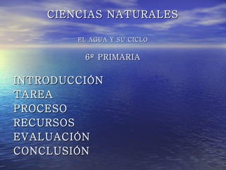 Este documento presenta una webquest sobre el agua y su ciclo para estudiantes de 6o grado de primaria. Los estudiantes investigarán en grupos preguntas sobre el origen del agua en la Tierra, sus estados, la formación de nubes, la evaporación, el ciclo del agua y la contaminación. Deberán tomar notas, imágenes y presentar oralmente sus hallazgos. El profesor evaluará la claridad de las explicaciones, imágenes y la propuesta de ideas para ahorrar agua.
