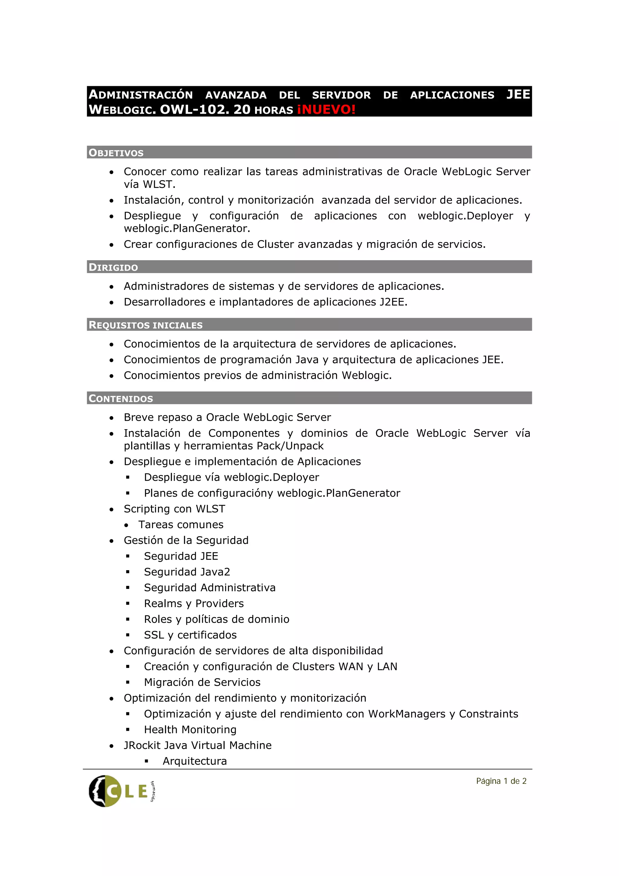 El documento describe un curso de 20 horas sobre la administración avanzada del servidor de aplicaciones JEE WebLogic, enfocado en la instalación, control y monitorización avanzada. Se dirige a administradores de sistemas y desarrolladores que posean conocimientos previos en WebLogic y programación Java. Los contenidos incluyen despliegue de aplicaciones, gestión de la seguridad, configuración de alta disponibilidad y optimización del rendimiento.