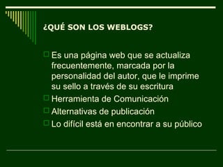 Este documento describe los blogs (weblogs) y su evolución. Explica que los blogs son páginas web actualizadas frecuentemente que reflejan la personalidad de su autor. Inicialmente, los autores de blogs solo querían comprobar que alguien estaba prestando atención a lo que escribían. Más tarde, los blogs evolucionaron hacia formatos narrativos como diarios personales o filtros de información. El documento también analiza las razones por las que la gente visita los blogs y predice que en el futuro habrá blogs profesionales escritos