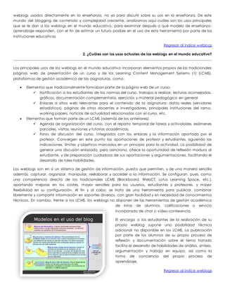 Este documento analiza los usos actuales de los weblogs (blogs) en el mundo educativo. Explica que los blogs se usan para comunicar información del curso a los estudiantes, como normas, lecturas y materiales. También se usan para foros de discusión entre profesores y estudiantes. Los blogs apoyan tanto la transmisión de conocimientos como modelos educativos más activos centrados en la resolución de problemas y la interacción social.