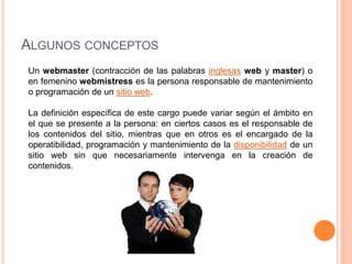 Un webmaster es la persona responsable del mantenimiento y programación de un sitio web. Sus responsabilidades pueden incluir el manejo de contenidos, la operación técnica, el mantenimiento de la disponibilidad del sitio, y la programación. Un webmaster exitoso requiere conocimientos en desarrollo web, diseño, bases de datos, administración de sistemas, seguridad, y habilidades blandas como la coordinación de proyectos y la redacción.