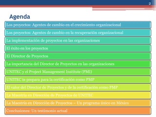 Este documento presenta la agenda de un seminario sobre nuevas visiones de la dirección de proyectos impartido por Alejandro Domínguez. El seminario cubre temas como los proyectos como agentes de cambio, el éxito en proyectos, el perfil del director de proyectos, la importancia de la certificación PMP y la maestría en dirección de proyectos de UNITEC.