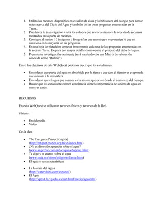El documento describe el ciclo del agua y una actividad de investigación sobre el tema. Los estudiantes investigarán el ciclo del agua, incluidos los estados del agua, cómo se forman las nubes, la evaporación y más. Presentarán sus hallazgos oralmente y analizarán qué sucedería si no existiera el ciclo del agua.