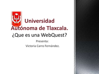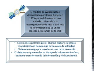 Este documento define una WebQuest como una actividad de investigación guiada donde la mayor parte de la información proviene de recursos en Internet. Promueve el desarrollo de habilidades cognitivas superiores, trabajo cooperativo y autonomía de los estudiantes. Los profesores usan WebQuests como recursos didácticos para que los estudiantes desarrollen habilidades de manejo de información y competencias relacionadas con la sociedad de la información.