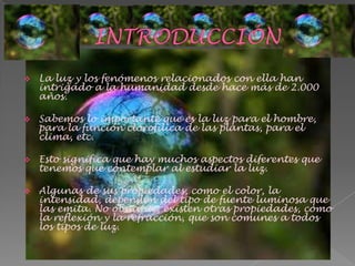 Este documento presenta información sobre un proyecto de investigación sobre la luz que los estudiantes deben completar en parejas. Los estudiantes deben investigar qué es la luz, cómo se propaga y cuál es su velocidad, así como los conceptos de sombras y eclipses. También deben estudiar las propiedades de la reflexión, la refracción, los materiales transparentes u opacos, y los colores y su mezcla. Finalmente, deben investigar la estructura del ojo humano y los defectos de la vista.