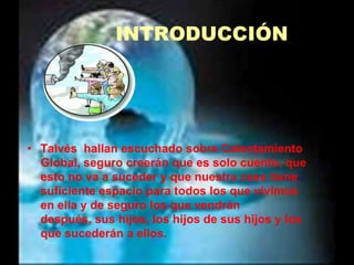 Este documento presenta una guía didáctica para enseñar a estudiantes sobre el calentamiento global. La guía incluye objetivos, contenidos, materiales, organización, evaluación y la integración de diferentes áreas académicas. El objetivo principal es que los estudiantes comprendan las causas y consecuencias del calentamiento global y tomen medidas para proteger el planeta.