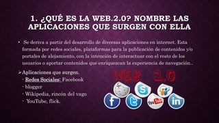 Este documento describe la Web 2.0 y las aplicaciones que surgen de ella como las redes sociales y YouTube. Explica la diferencia entre la Web 1.0 y la Web 2.0, señalando que la Web 2.0 tiene contenidos administrados por usuarios que están en constante cambio. También define qué es un blog, sus usos educativos y sitios web gratuitos para crear blogs como Blogger y Weebly. Finalmente, indica que se debe crear una cuenta en Gmail para acceder fácilmente a una cuenta de blog en Blogger.