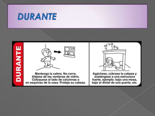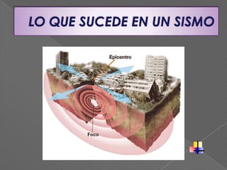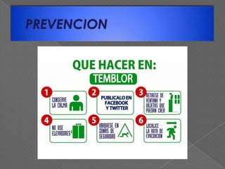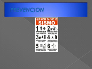Este documento presenta información sobre qué hacer antes, durante y después de un sismo. Antes de un sismo, es importante realizar simulacros de evacuación, asegurar objetos que puedan caerse y reunir documentos importantes. Durante un sismo, se debe evacuar de manera ordenada y alejarse de objetos que puedan causar lesiones. Después de un sismo, es importante mantener la calma, cortar el suministro de gas y electricidad, y usar el teléfono solo para emergencias.