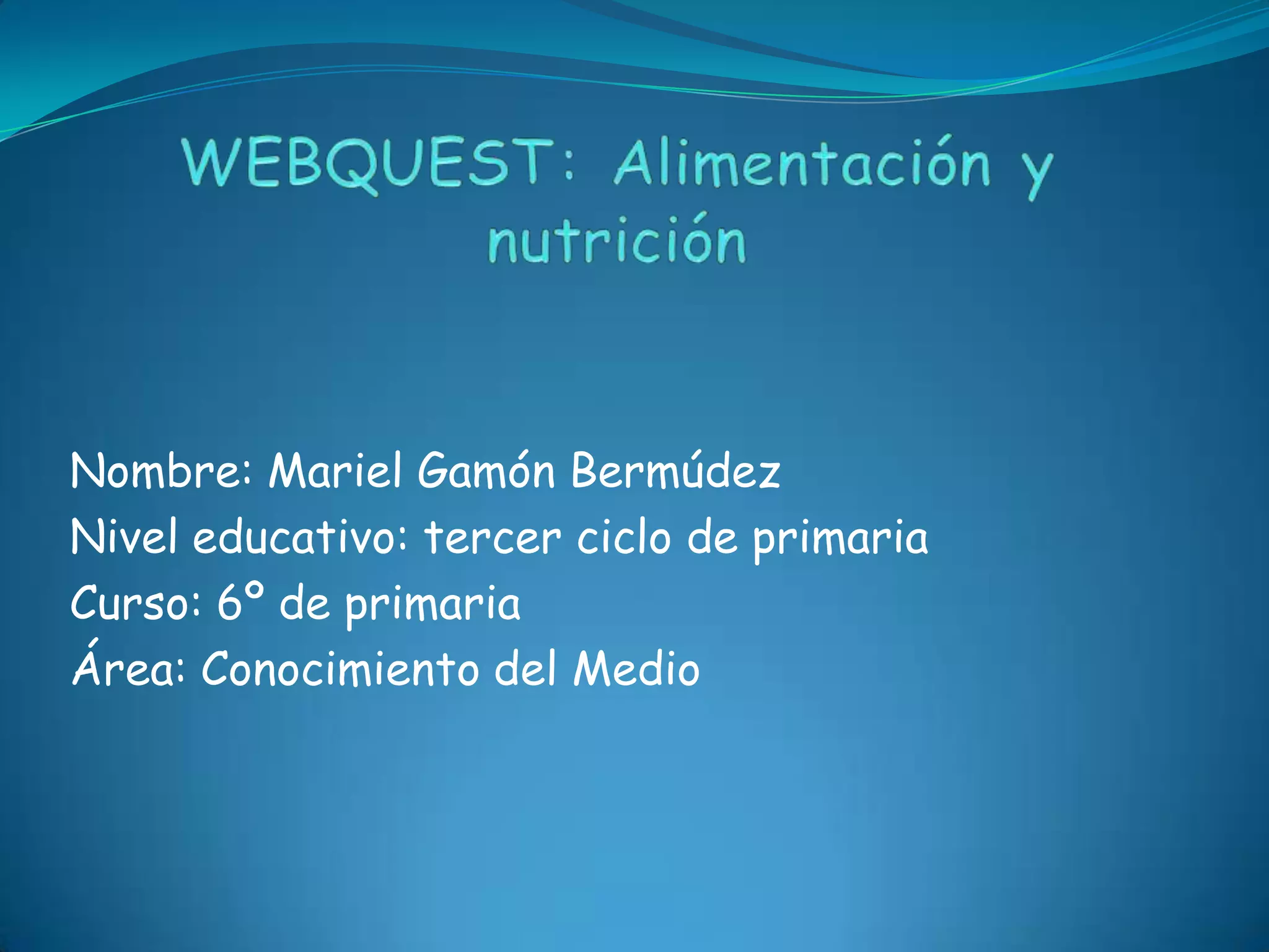 Este documento presenta una webquest sobre alimentación y nutrición para estudiantes de sexto grado de primaria. La tarea incluye preguntas sobre los nutrientes principales, sus funciones y fuentes alimenticias, así como instrucciones para crear una pirámide alimenticia y resumir los principios de una dieta saludable. Los estudiantes deben buscar la información en las páginas proporcionadas y presentar sus respuestas de manera ordenada en una cartulina para su evaluación.