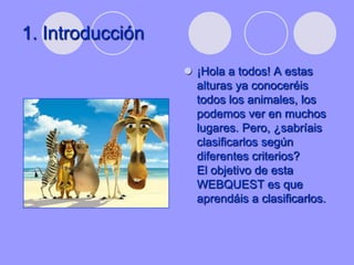 Este documento presenta una webquest sobre la clasificación de animales dirigida a estudiantes de primaria. La tarea consiste en clasificar animales según su capacidad de desplazamiento, si tienen esqueleto interno, su hábitat y alimentación. Los estudiantes deberán buscar información en varias páginas web, preparar una presentación y exponerla ante la clase. Se evaluará el contenido, la ortografía y expresión escrita, y la presentación oral.