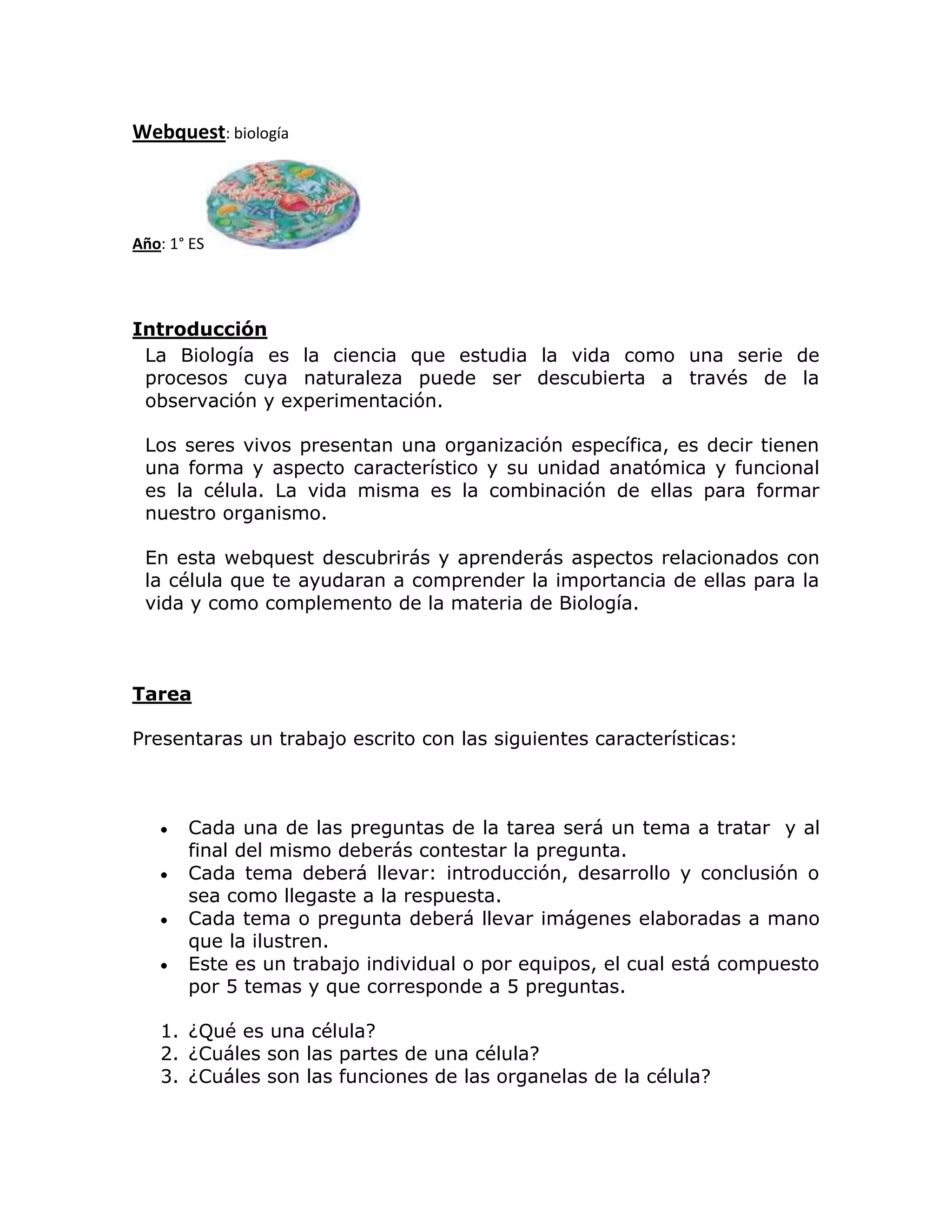Este documento presenta una webquest sobre biología celular para estudiantes de primer año. La tarea consiste en un trabajo escrito que responde 5 preguntas sobre células, incluyendo su definición, partes, funciones de organelas, y las diferencias entre células procariotas, eucariotas, vegetales y animales. Se proveen recursos en línea para completar la tarea y se evalúa la precisión de la información, completitud del trabajo, calidad de imágenes, y estructura de las secciones.