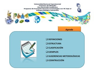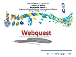 Este documento presenta una guía sobre las webquest, definiéndolas como actividades didácticas que utilizan recursos de Internet preseleccionados por el docente. Explica que su estructura típica incluye una introducción, tarea, proceso, recursos, evaluación y conclusión. Además, ofrece sugerencias para cada sección como incluir objetivos claros y recursos pertinentes, y recomienda herramientas para construir webquest como editores en línea o de documentos.