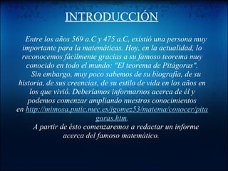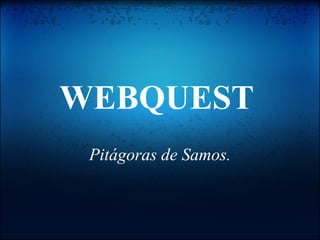 Este documento presenta una webquest sobre Pitágoras de Samos, un importante matemático de la antigüedad. Introduce a Pitágoras y su famoso teorema, e invita a los estudiantes a aprender más sobre su biografía e ideas a través de enlaces de internet. Como tarea, pide a los estudiantes que escriban una biografía imaginaria en primera persona como si fueran Pitágoras, y que identifiquen y expliquen sus descubrimientos matemáticos. El documento concluye invitando a los estudiant