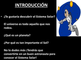 El documento presenta una actividad para que estudiantes aprendan sobre el sistema solar. Los estudiantes serán divididos en 4 grupos, cada uno con una tarea diferente relacionada con características del sistema solar. Los grupos deberán investigar su tema asignado y presentar sus hallazgos en una presentación de PowerPoint que luego expondrán ante la clase.