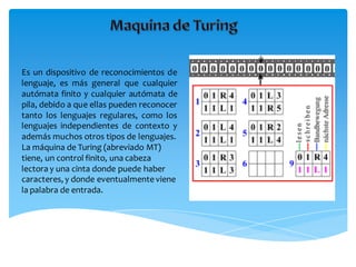 Este documento describe la máquina de Turing, un modelo de autómata teórico que consiste en un cabezal lector/escritor y una cinta infinita. La máquina se mueve a lo largo de la cinta leyendo y reemplazando símbolos según una tabla de transiciones que especifica el nuevo estado y posición del cabezal basado en el estado y símbolo actuales. La máquina de Turing puede reconocer cualquier lenguaje formal recursivamente enumerable y tiene mayor poder computacional que autómatas más simples como los autómat