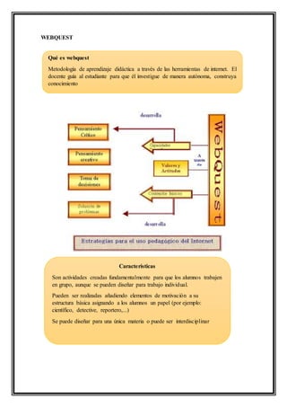 Un webquest es una metodología de aprendizaje a través de internet donde el docente guía al estudiante en la investigación autónoma para construir conocimiento. Las características principales son que se enfocan en el trabajo en grupo utilizando roles como científicos o periodistas, y pueden abarcar una sola materia o ser interdisciplinarias. El comentario personal indica que los webquest permiten aprender sobre tecnología y aplicar conocimientos para beneficiar a la sociedad e impartir nuevos conocimientos a otros estudiantes.