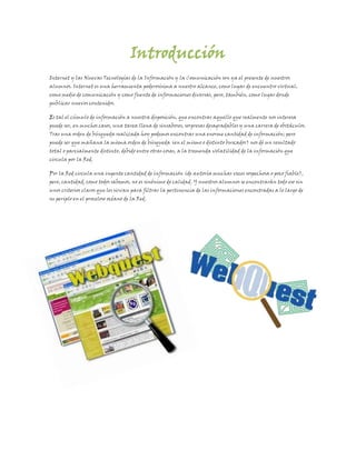 Este documento describe las WebQuest, actividades educativas basadas en Internet. Explica que las WebQuest guían a los estudiantes a través de tareas de investigación utilizando recursos en línea. Detalla que una WebQuest típica incluye una introducción, tareas, procesos, recursos, evaluación y conclusión. El objetivo es que los estudiantes construyan su propio conocimiento al completar las actividades orientadas y usar la información de manera efectiva.