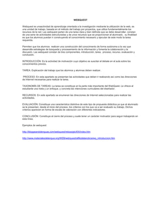 Un webquest es una actividad de aprendizaje basada en proyectos que utiliza recursos de Internet. Consta de una introducción para motivar a los estudiantes, una tarea clara que deben completar, un proceso con actividades estructuradas y recursos en línea, criterios de evaluación, y una conclusión. Los webquest permiten a los estudiantes construir conocimiento de forma autónoma mediante la búsqueda y el procesamiento de información en línea de manera colaborativa.