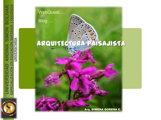 Este documento presenta una webquest sobre arquitectura paisajista. Propone cuatro tareas individuales y tres tareas grupales relacionadas con el análisis y diseño de paisajes. Las tareas incluyen elaborar monografías, cuadros sinópticos, fichas de vegetación e inventarios, y diseñar una propuesta paisajística aplicando los conocimientos adquiridos. Proporciona enlaces a recursos para cada tarea.