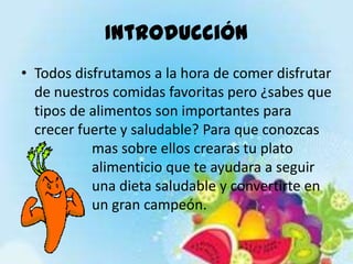 Este documento presenta un webquest sobre el plato alimenticio saludable. Los estudiantes deben investigar los grupos alimenticios importantes, las porciones adecuadas de cada grupo, y los alimentos recomendados para acompañar las comidas. También deben aprender por qué la actividad física es importante y cuánto tiempo deben dedicarle los niños y adultos. Luego, trabajando en grupos, los estudiantes crearán un plato alimenticio en una cartulina para demostrar lo que han aprendido. Al final, cada grupo
